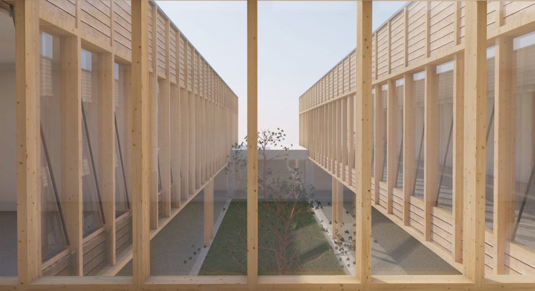 Se proyecta la rehabilitación de un edificio existente, regularizando el volumen e integrando el conjunto bajo una "piel" de madera termotratada que aporta la privacidad y control solar óptimo a la vez que singulariza el elemento en la trama urbana.